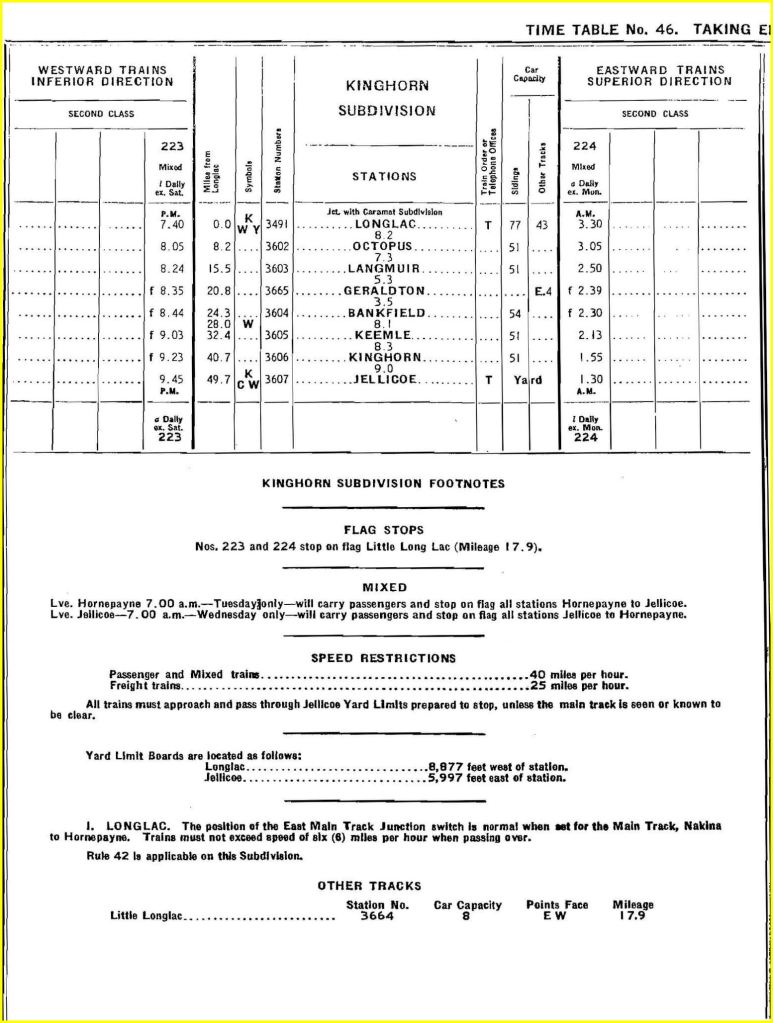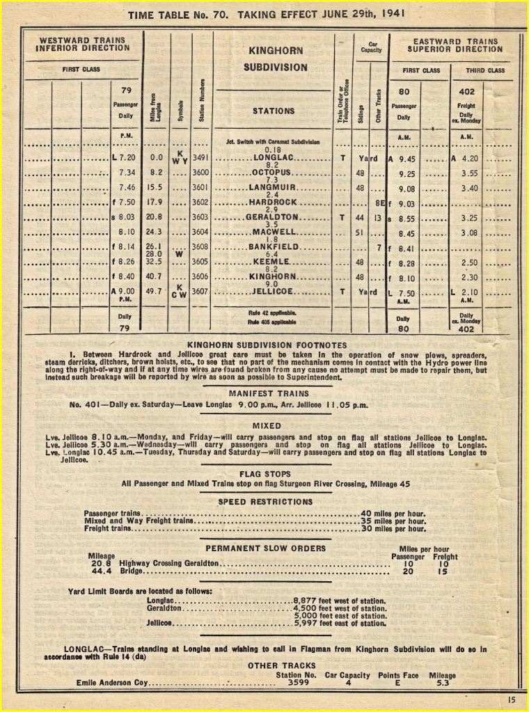 McDaid was killed by Train 223, which timetables establish was a daily westbound mixed train scheduled to stop at Kinghorn at 9:23 p.m. The train was running late, for trainmen testified that the accident occurred about 10:30 p.m. Reading between the lines, one can assume McDaid was waiting after dusk to catch the 223 to Jellicoe, and dozed off.