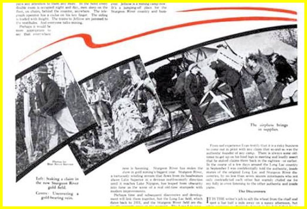 The same report stated: “The large number of lakes . . . makes airplane service very convenient . . . Goods are landed at Coyle lake, portaged a quarter of a mile north to the Sturgeon river, taken downstream past one rapid, and then portaged to reach the camps of either Sturgeon River Gold Mines or Brengold Mines.”