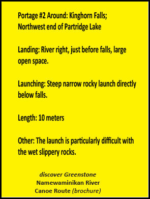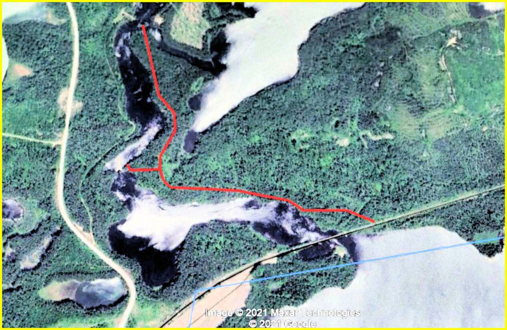 A Google Earth view of the area reveals an impression of this trail on the right bank, 0.8 km (0.5 mi.) long. The view also shows it extending 0.8 km farther to Lapierre Creek. There is also the trace of a short trail joining the main trail to the portage around the falls. Rob Haslam, a Geraldton resident, recalls leading a party of canoeists downstream from Partridge Lake in mid June 2018 during high water. He found the launch site (called a landing, in canoeist lingo) too treacherous. His party cut a temporary trail on the left bank to the loop road.