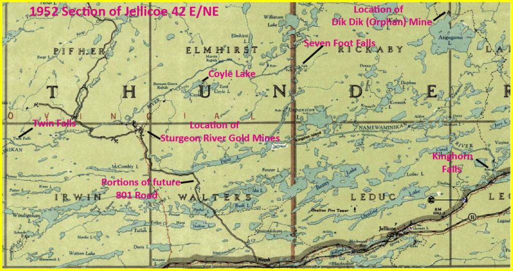 In 1940, the Sturgeon River Gold Area was quiet. An all-season motor road provided access to Sturgeon River Gold Mines, the only operating mine. The Dik Dik, aka the Orphan, was mothballed. Kinghorn sawmill had shut down. Freighter canoes no longer plied the river. Regularly, twice a day, a train broke the silence. The village of Jellicoe was nodding off.