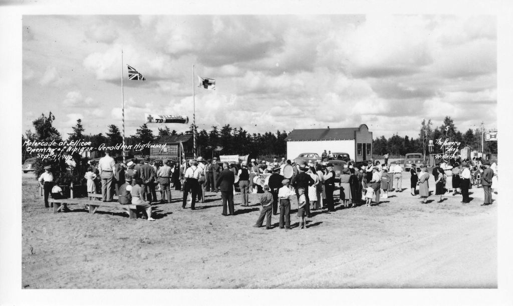 Geraldton’s official history describes a time of celebration: “On September 7th, 1940, Highway 11 officially opened. Early Saturday morning, a motorcade left Geraldton accompanied by the Goldfield Band. Around noon in Nipigon, they met a Lakehead motorcade. After some functions there, the combined motorcades stopped in Beardmore for a reception and luncheon, and then in Jellicoe for a ribbon-cutting ceremony. At suppertime, everyone arrived at the town square in Geraldton, where the Hon. T.B. McQuesten declared the highway officially opened.”