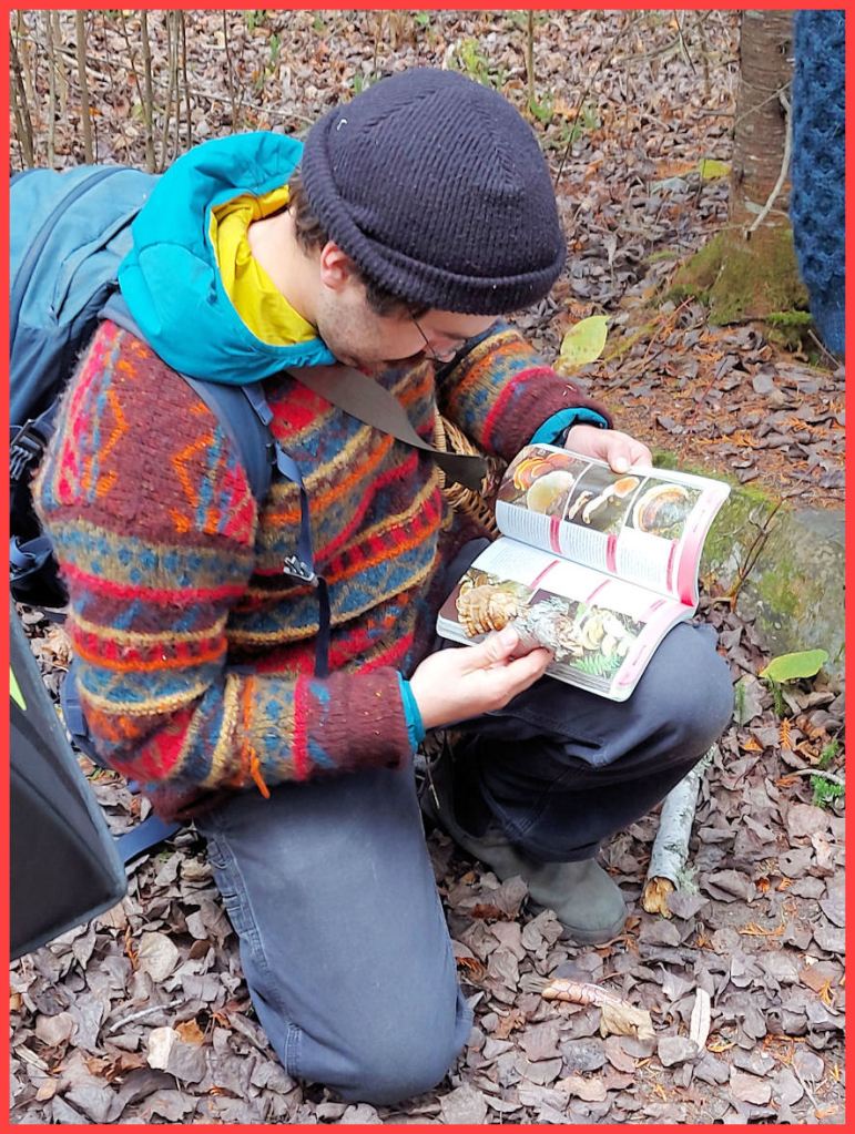 Ben has an encyclopedic knowledge of fungi which he will quote without prompting. What endeared him to Sue and me was that he carried a book in his fisherman’s creel (his mushroom basket). It is a book about mushrooms. And he is not shy about consulting it.