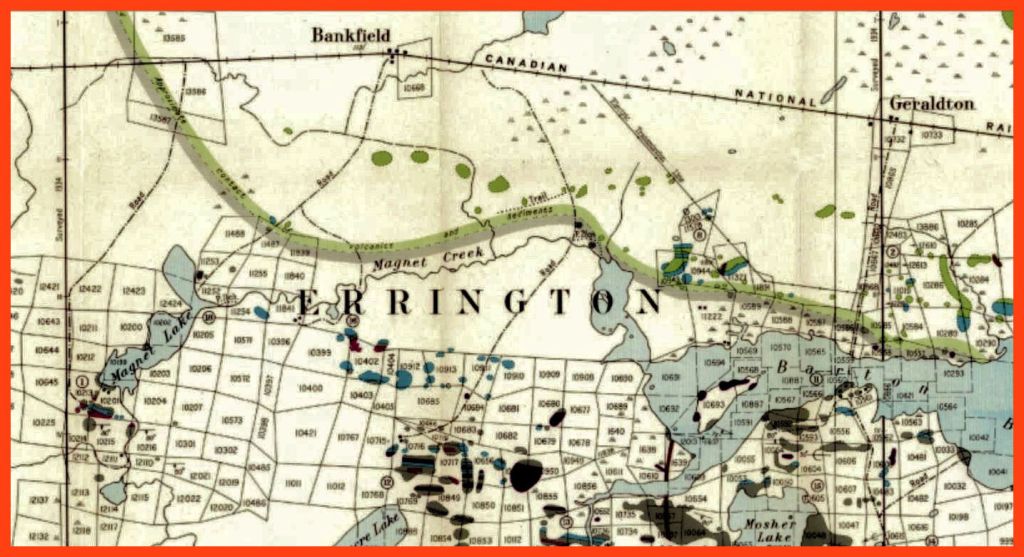 The 1934 map also shows a “road” linking the Bankfield station to the north shore of Magnet Lake. It was a seasonal winter road which traversed a broad swampland. A sketch map labeled it the Wells-Johnson road. In May, two drills, one operated by gasoline and one by steam, were transported over it with great difficulty, the bad spots in the road being corduroyed. Eventually the headframe of the Bankfield mine rose on the south shore of the lake.