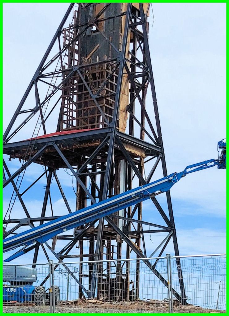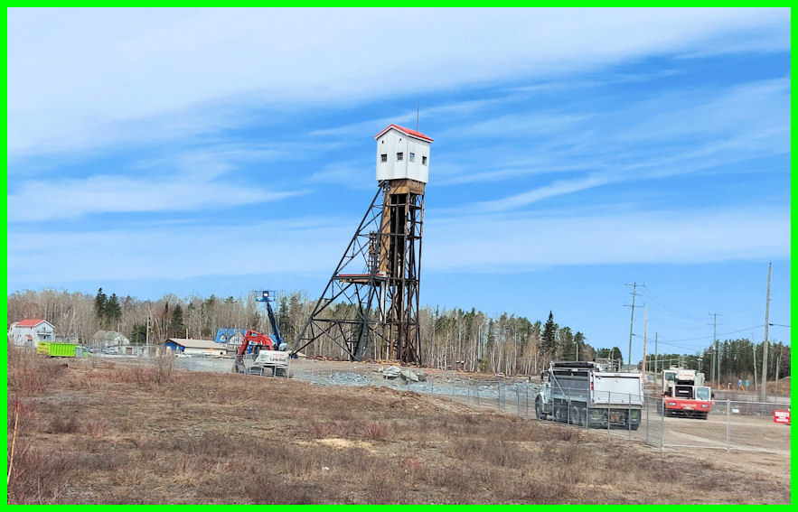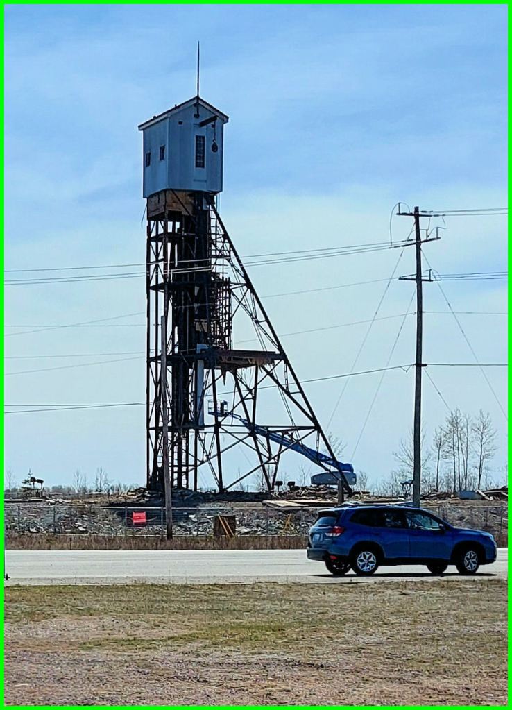 Tom Jones Corporation of Thunder Bay has a machine parked at the historic No. 1 headframe, in process of demolishing it. The shaft of the MacLeod-Cockshutt mine was sunk in 1934. However, some labour problem (a strike?) has halted the demolition. Nothing on the Tom Jones website, not even a mention of any controversial contract in Greenstone. There’s a question if Tom Jones is the contractor.