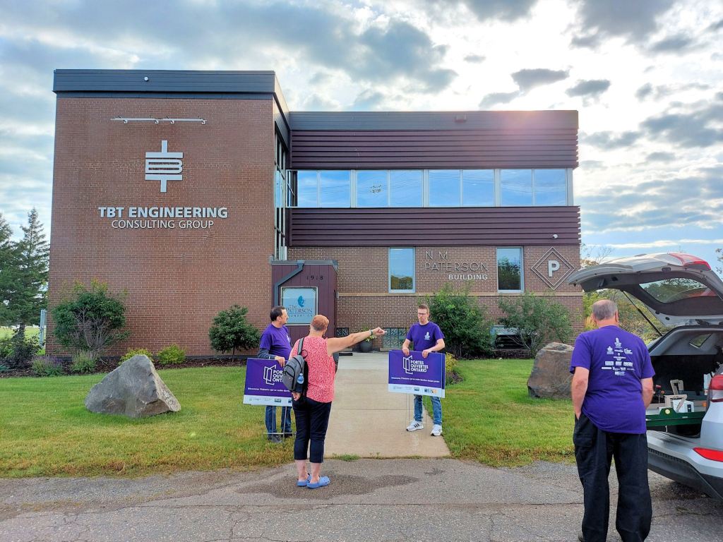 Two guys with purple crested t-shirts greeted us. It was 9:50 a.m. Doors opened at 10:00. Employees of TBT Engineering Consulting Group were serving as greeters and guides. We were first in line.