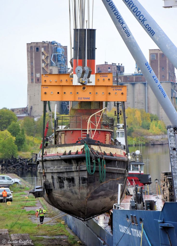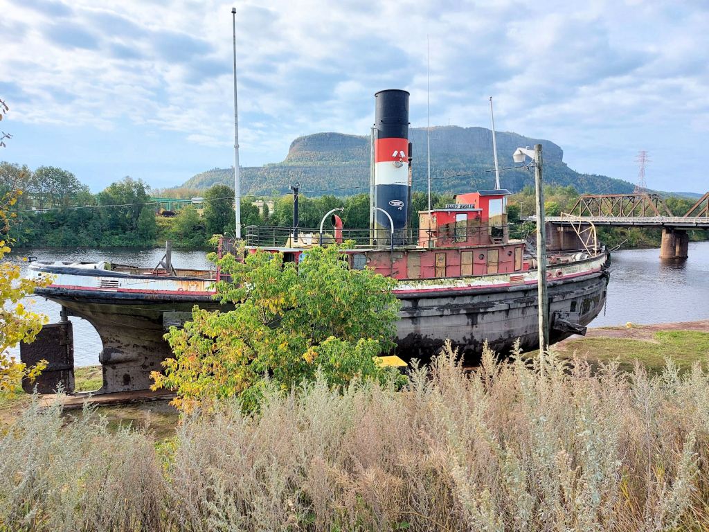 One of the guys said the historic tug James Whalen was parked a few metres away on the river bank. Earlier, the tug had been moored on the Kaministiquia River, waiting appropriate disposition for such a relic. When the river was running high in early spring, the tugboat’s pumps had failed and the boat sank. Over the last two days, an expensive and elaborate operation had recovered the tug and given it a temporary home.