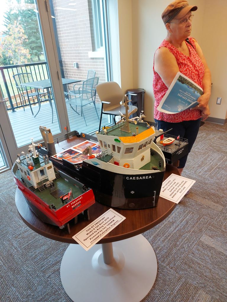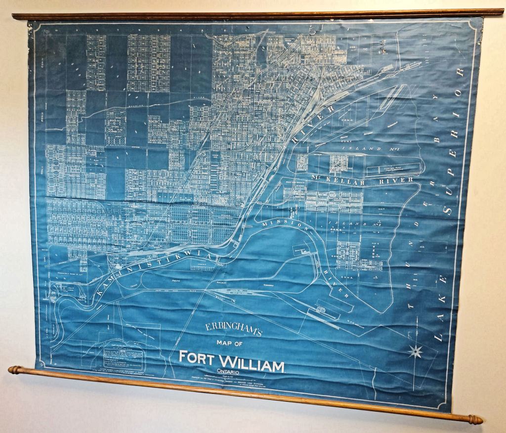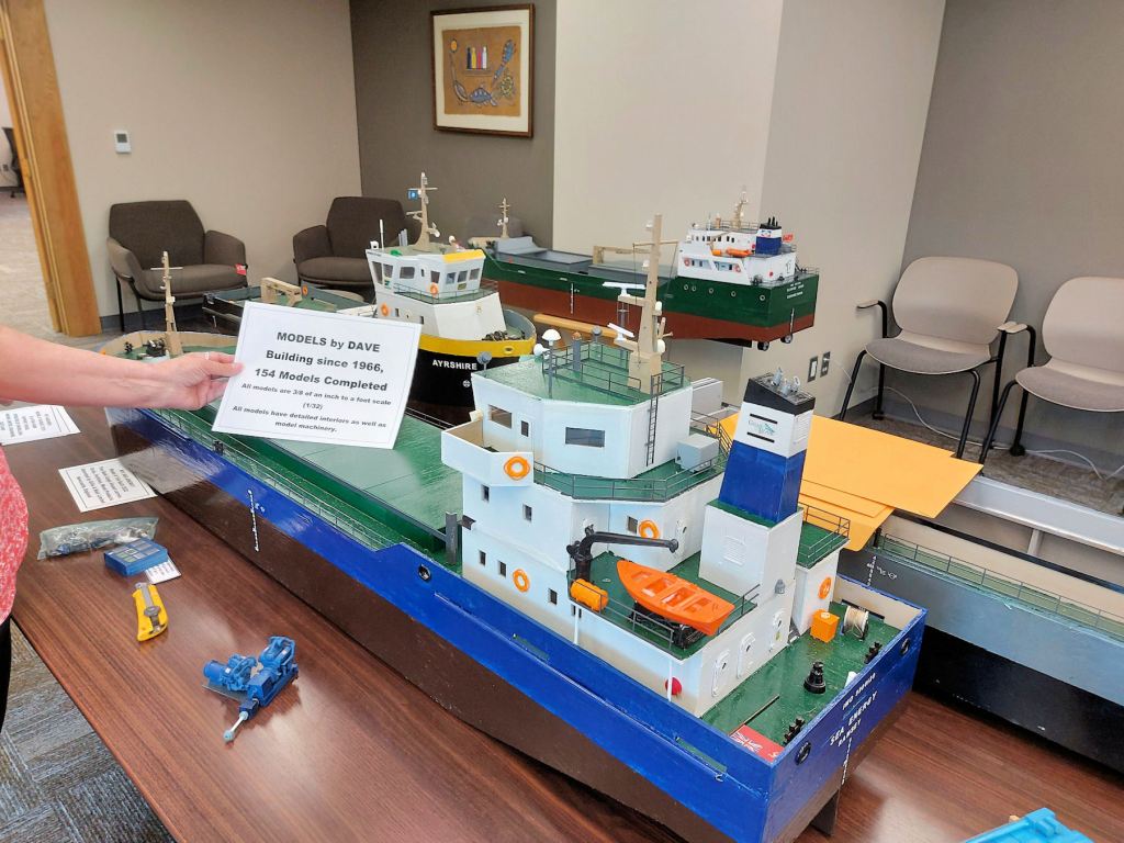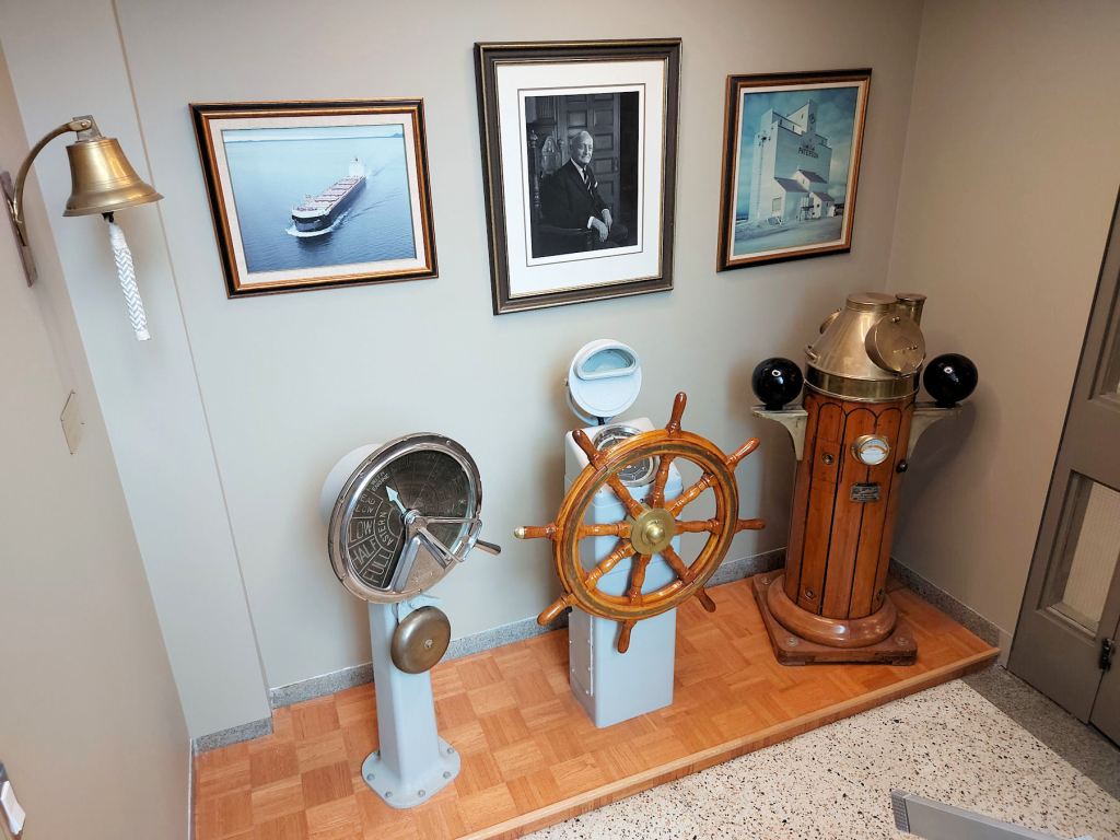 We were handed off to a guide, a TBT Engineering employee in a purple t-shirt. She led us upstairs. The first striking display was a huge model of a Paterson grain-hauling vessel and a gigantic wall map depicting a plan of Fort William in 1913. I dropped out the tour group as I lingered and marveled.