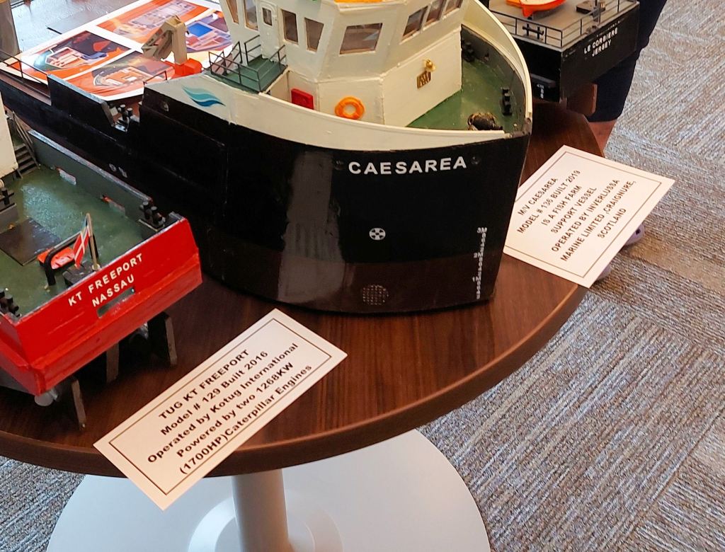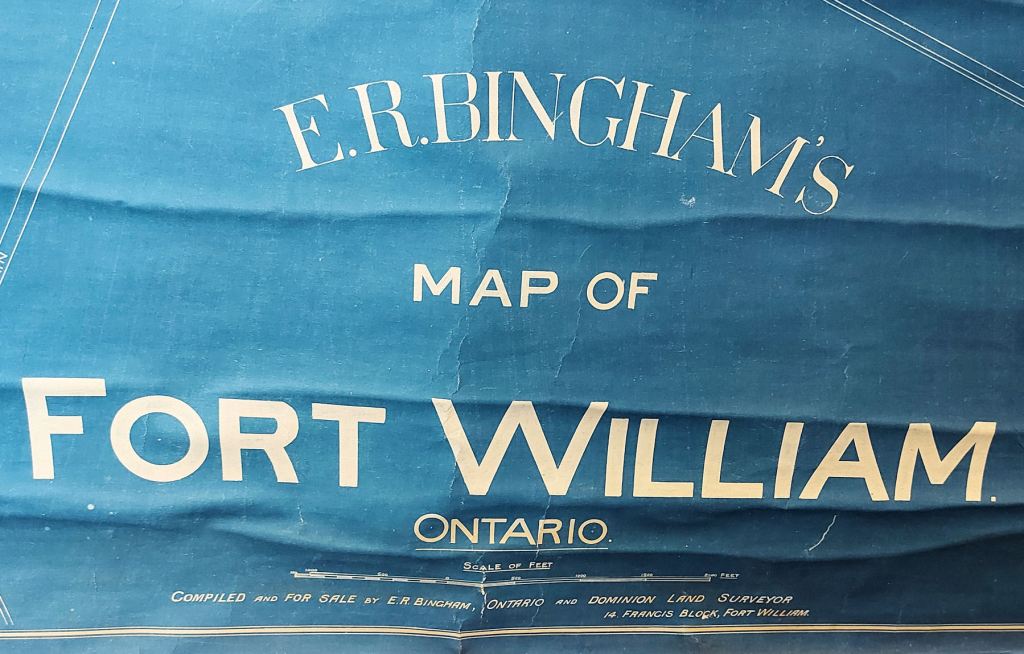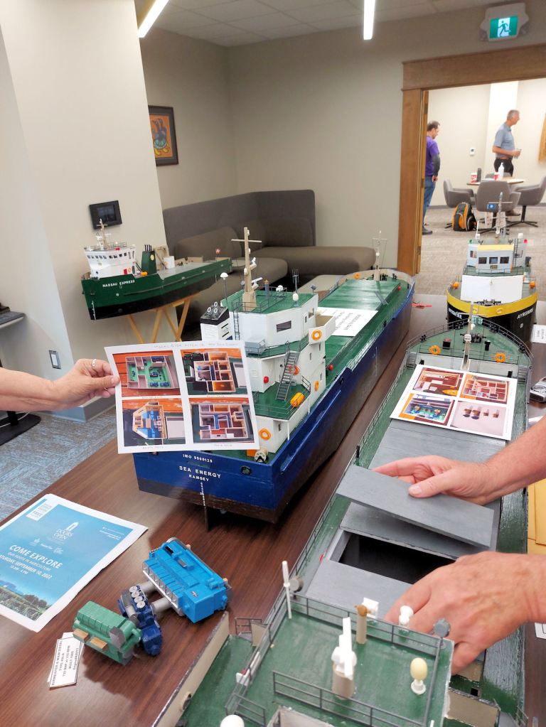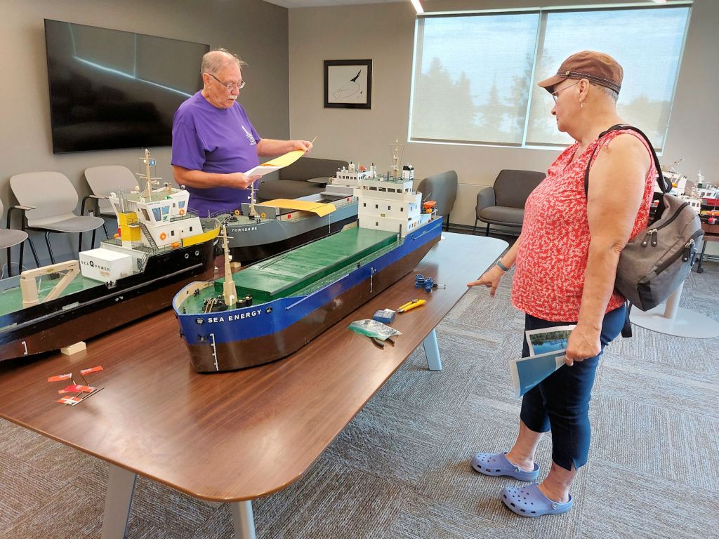 We were handed off to a guide, a TBT Engineering employee in a purple t-shirt. She led us upstairs. The first striking display was a huge model of a Paterson grain-hauling vessel and a gigantic wall map depicting a plan of Fort William in 1913. I dropped out the tour group as I lingered and marveled.