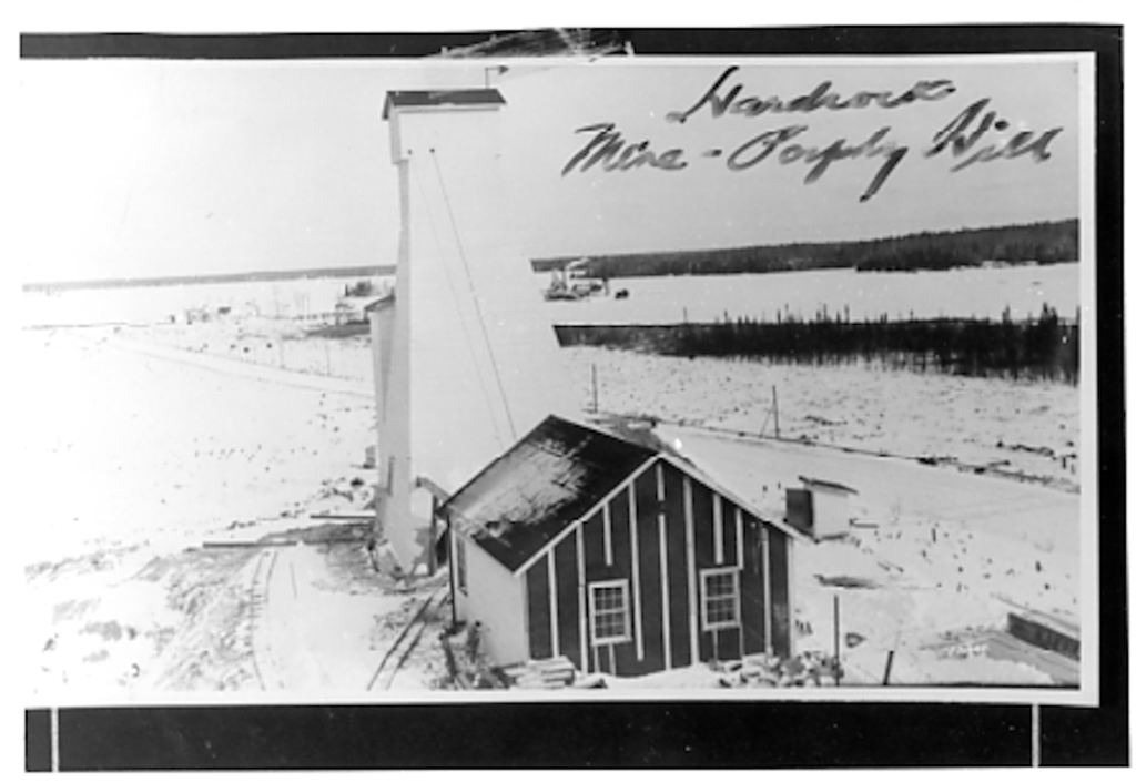 Headframe of Shaft No. 2 of Hard Rock Gold Mines, Ltd., aka the Hardrock mine, located on Porphyry Hill. Beyond and to the right one catches a glimpse of Shaft No. 1 and smoke rising from Discovery Point on Kenogamisis Lake. Photo G.H.C.