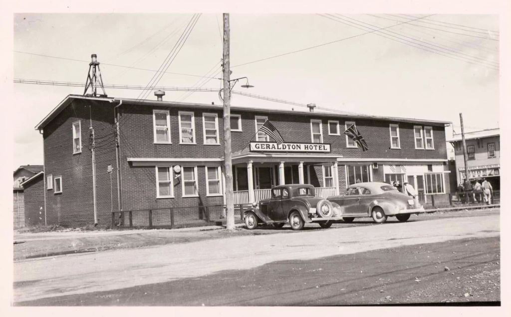 The Geraldton Hotel sometime after the town’s incorporation in September 1937. First Avenue North is graded, open ditch and parking ramps are gone, and wooden sidewalks and street lamps are installed, dating this image to circa 1938. The fire siren sits on the hotel roof. To the far R, a portion of the Gordon Block, housing the Royal Bank, is visible. All photos from Greenstone Historical Collection.