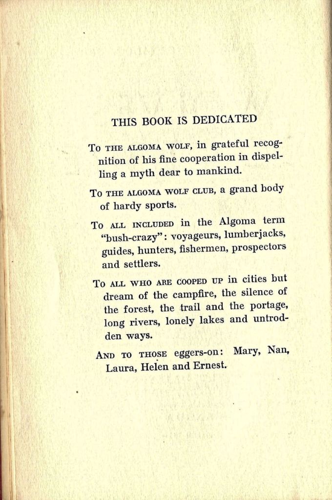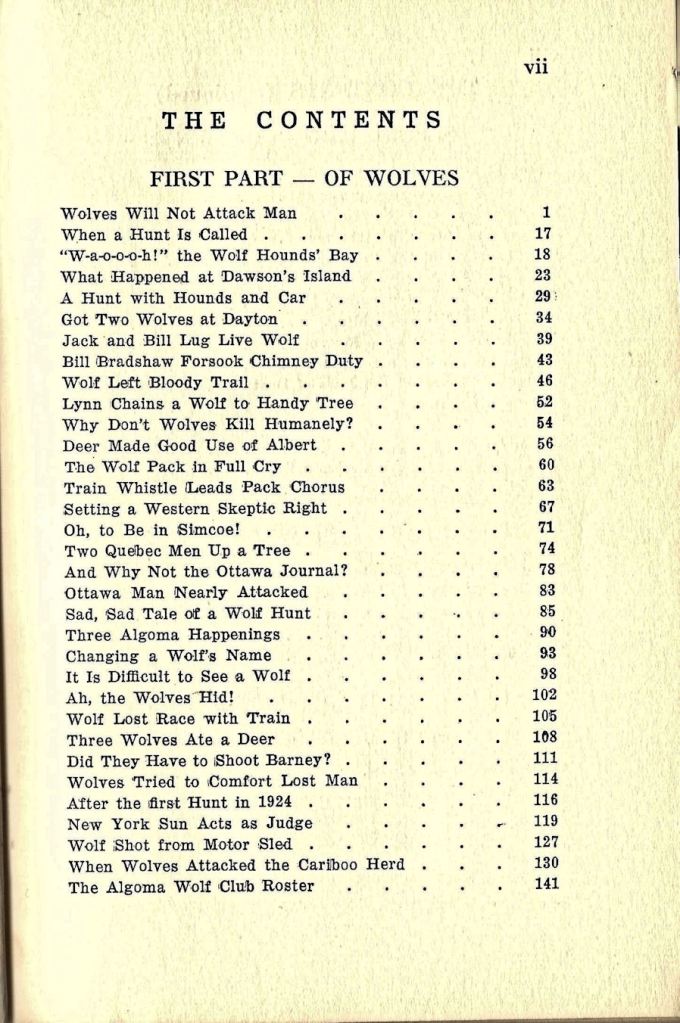 The table of contents omits chapter numbers, an interesting feature. The first chapter, “Wolves Will Not Attack Men” , expresses the thesis of the book. The chapter that begins on page 114 reinforces that thesis.