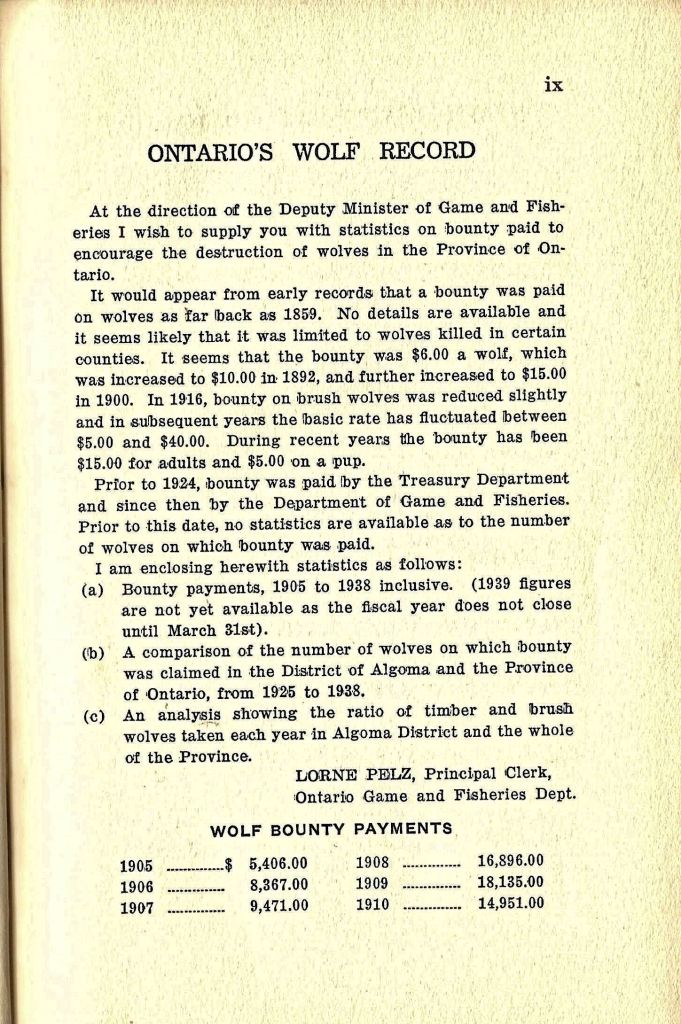 Almost from the beginning, Ontario tried to extirpate its wolves. Yes, “extirpate”, meaning something like “to encourage the destruction of wolves” (1914 Wolf Bounty Act). The first bounties began in 1793, when Ontario was still Upper Canada (“Of Bounty and Beastly Tales: Wolves and the Canadian Imagination”, Stephanie Rutherford, Trent University, 2019).