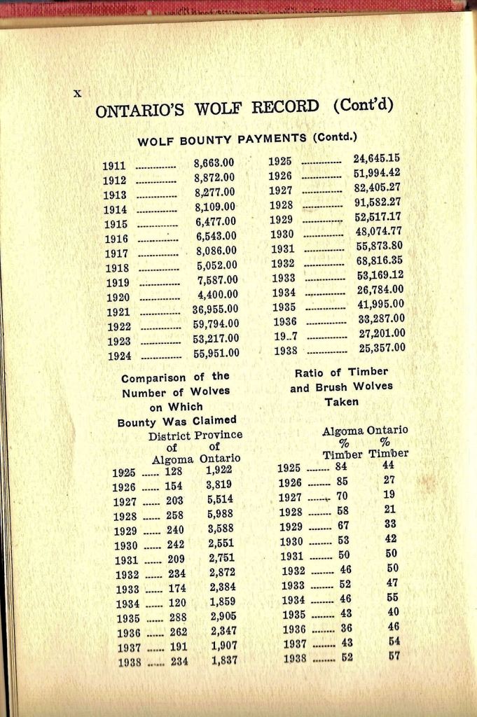 Note a typo in the section “Ratio of Timber and Brush Wolves Taken”. One subsection is “Algoma % Timber [Wolves]”; the next subsection should read “Ontario % Brush [Wolves]”.
