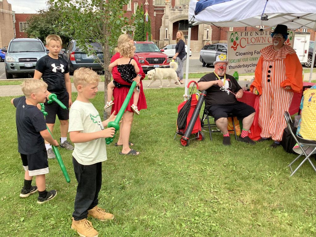 Kids sharpen their balloon swords. The fellow with the red nose created these weapons.
